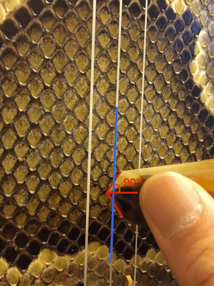 二つ前の写真(バチのNGな角度)を上から見るとこういう角度になっています。こっちのほうが上から見ると自然な角度なんですよね。なのでこうやって引きがちです。