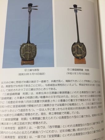 手に入れたのは沖縄県立博物館著の「特別展 三線のひろがりと可能性展」という79ページの本。いわゆる沖縄県の指定有形文化財に指定されている名器が掲載、解説されています。三線を弾いている方であれば、五開鐘(ケージョー)の名を聞いたことはあるでしょう。その開鐘の写真などがずらっと掲載されています。